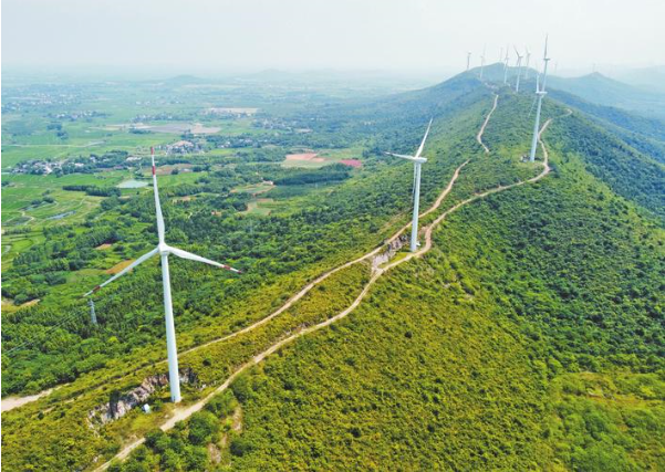 7月25日,記者在無為市嚴橋鎮華電福新風電場看到,高聳的風電機組點綴在青山綠水間,猶如一座座大風車,構成一幅美麗的鄉村畫卷。據悉,該風電場共有80臺風力發電機組,去年發電量3.54億千瓦時。(記者 楊大偉 攝)