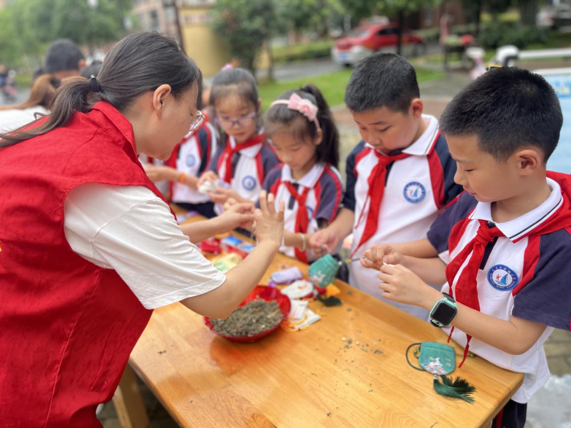 六月端午配香囊,驅邪避穢保健康。小學生們在志愿者的幫助下,開始制作香囊,他們選擇自己喜歡的香料裝進空香包里。很快,一個個色彩鮮艷、香味濃郁的香囊就制作完成了。小小的香囊不僅是對傳統文化的傳承,更是寄托了大家對身體安康的祝愿。