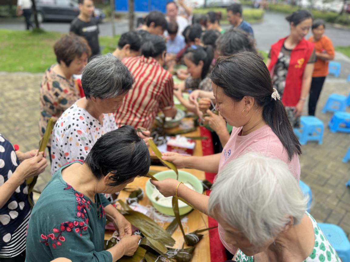 和睦鄰里情,端午粽飄香。社區工作人員早早已經準備好了鮮綠的粽葉、潔白的糯米。阿姨們圍在一起,拿起粽葉,裝上糯米,一陣翻轉,再捆扎,不一會功夫,一個個飽滿清香的粽子擺滿了桌子。大家一起說說笑笑,濃濃的節日氛拉近了社區居民的心。