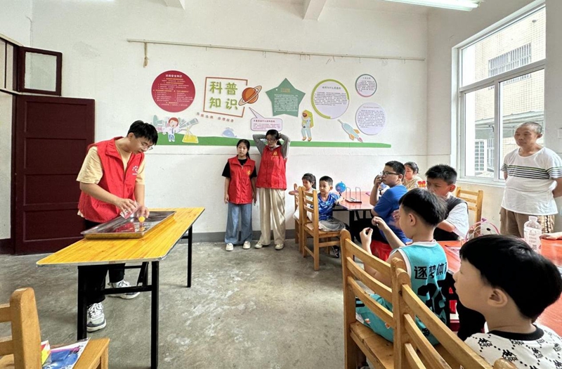 社區(qū)志愿者向孩子們展示科普實(shí)驗(yàn)