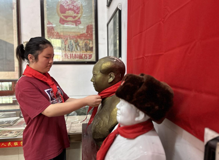 圖為少先隊員參觀紅色展品時為毛主席雕像佩戴紅領巾