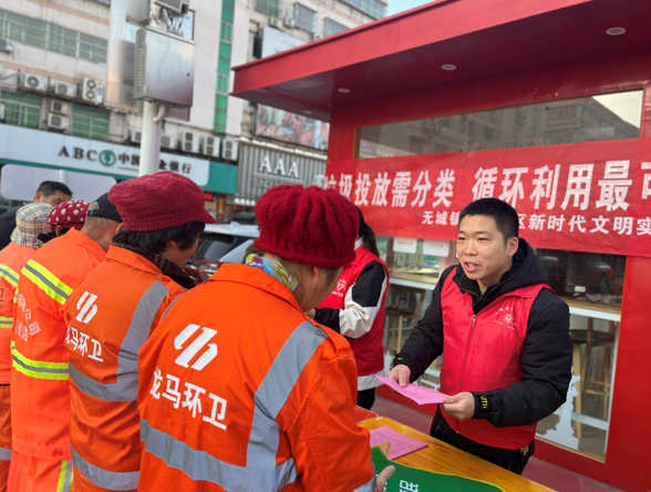 宣傳進社區,垃圾分類我先行。11月23日,無城鎮皇武社區新時代文明實踐 “鼓樓新風”志愿服務隊在人民廣場開展“垃圾投放需分類 循環利用最可貴”主題宣傳活動。志愿者向現場環衛工人發放垃圾分類宣傳資料,面對面講解垃圾分類現狀情況、垃圾分類知識和分類分揀技巧,以圖文并茂、現場互動等形式對環衛工人進行淺顯易懂的指導,讓環衛工人了解分類、學會分類、主動分類、帶頭分類,以便將垃圾分類融入日常的清掃保潔工作中,提高垃圾分類的精準性。