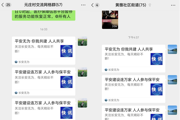 黃雒堅持線上線下相結(jié)合,線下利用電子屏、社區(qū)喇叭循環(huán)播放平安建設(shè)宣傳內(nèi)容,張貼宣傳海報、橫幅;線上搭建宣傳“網(wǎng)絡(luò)陣地”,充分利用微信工作群、朋友圈等載體,及時發(fā)布平安建設(shè)的信息、動態(tài)與成效。