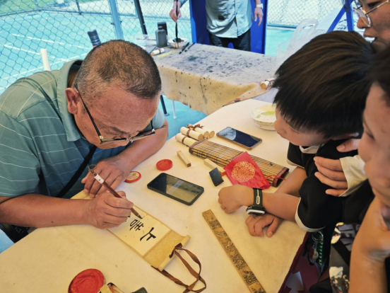 社區精心設置的“花小渡集市攤”成為活動亮點。攤位上擺滿各類書法文創周邊,既有印著書法作品的折扇、書簽,也有融入書畫元素的帆布包、水杯等。這些文創實用美觀,更承載傳統文化韻味。部分文創義賣,所得用于社區文化活動;同時為居民準備小份文創禮品贈送,讓大家帶走文化記憶。
