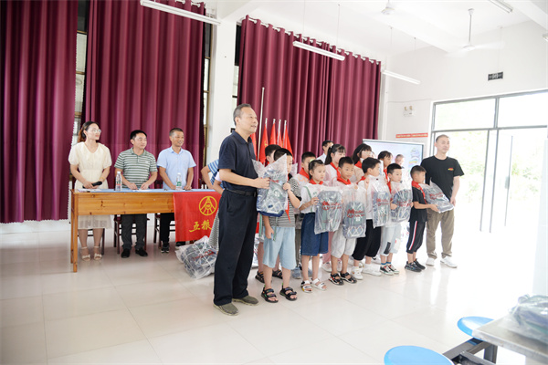 隨后,戴尉華一行來到了仁泉小學,開展新學期、捐贈新書包活動,共向仁泉小學100余名小學生,每人贈送了一個印有“紅色五區、精神賡續”的書包。戴尉華在捐贈儀式上,深情回顧了自己的父親,現年96歲的新四軍老戰士戴祠的革命經歷。戴祠13歲參軍,成為新四軍七師19旅56團偵察連的一名“小兵張嘎”,送情報、抓奸細、購藥品、察敵情,多次往返于淪陷區,履險蹈危。有一次被日軍從土橋一直追趕至練溪境內,得一老鄉幫忙,藏于地窖中而幸免,然而該老鄉十幾歲的兒子被日軍抓捕而殺害;中華人民共和國成立后,他和父親戴祠多次尋找這位老鄉,苦于無果,這也成為他父親至今都解不開的心結。戴尉華最后寄語廣大學生“青春由磨礪而出彩,人生因奮斗而升華。”