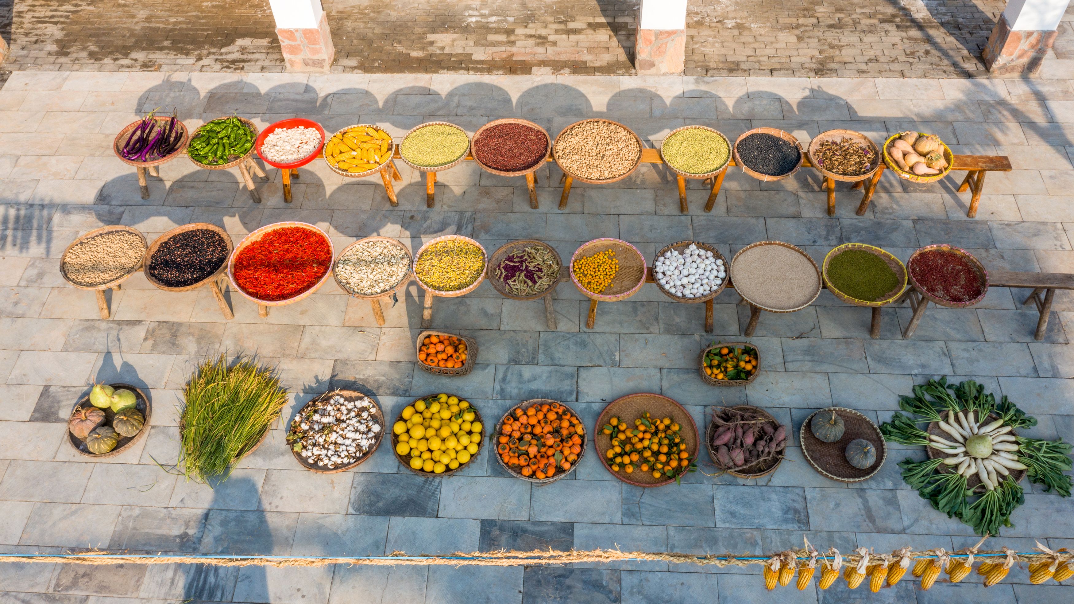 通過尋秋、曬秋、展秋,將玉米、柿子、辣椒、花生等一系列農作物分裝晾曬于門前,紅彤彤的柿子、金燦燦的玉米、火紅的辣椒……各種瓜果在陽光的照耀下彌漫清香,繪成了一幅五彩斑斕的農俗畫卷,形成一場關于秋的視覺盛宴。