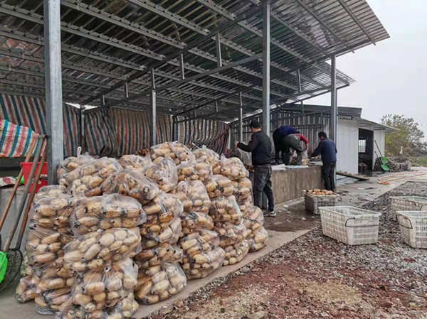 2022年8月,龍泉村駐村工作隊在開展鄉村振興“大走訪、大調研、大提升”活動時,村民反映當地盛產的蓮藕、荸薺產量高、品質好,但由于客源和價格都不穩定,導致銷售難、價格低,年年增產卻難增收。在了解這一情況后,駐村工作隊主動作為,立即和村“兩委”進行商量,研究制定具體方案,在報請上級部門批準后,經過多方協調,動員村種植大戶洪建和一名經紀人共同投資30多萬元,在一處閑置坑塘地建設了這座蓮藕、荸薺集散市場,為全鎮種植戶提供交易服務,統一收購價格,不僅擴大了銷售規模,有效解決了當地蓮藕、荸薺銷售難問題,而且還幫助一部分村民在市場內靈活就業,增加務工收入。