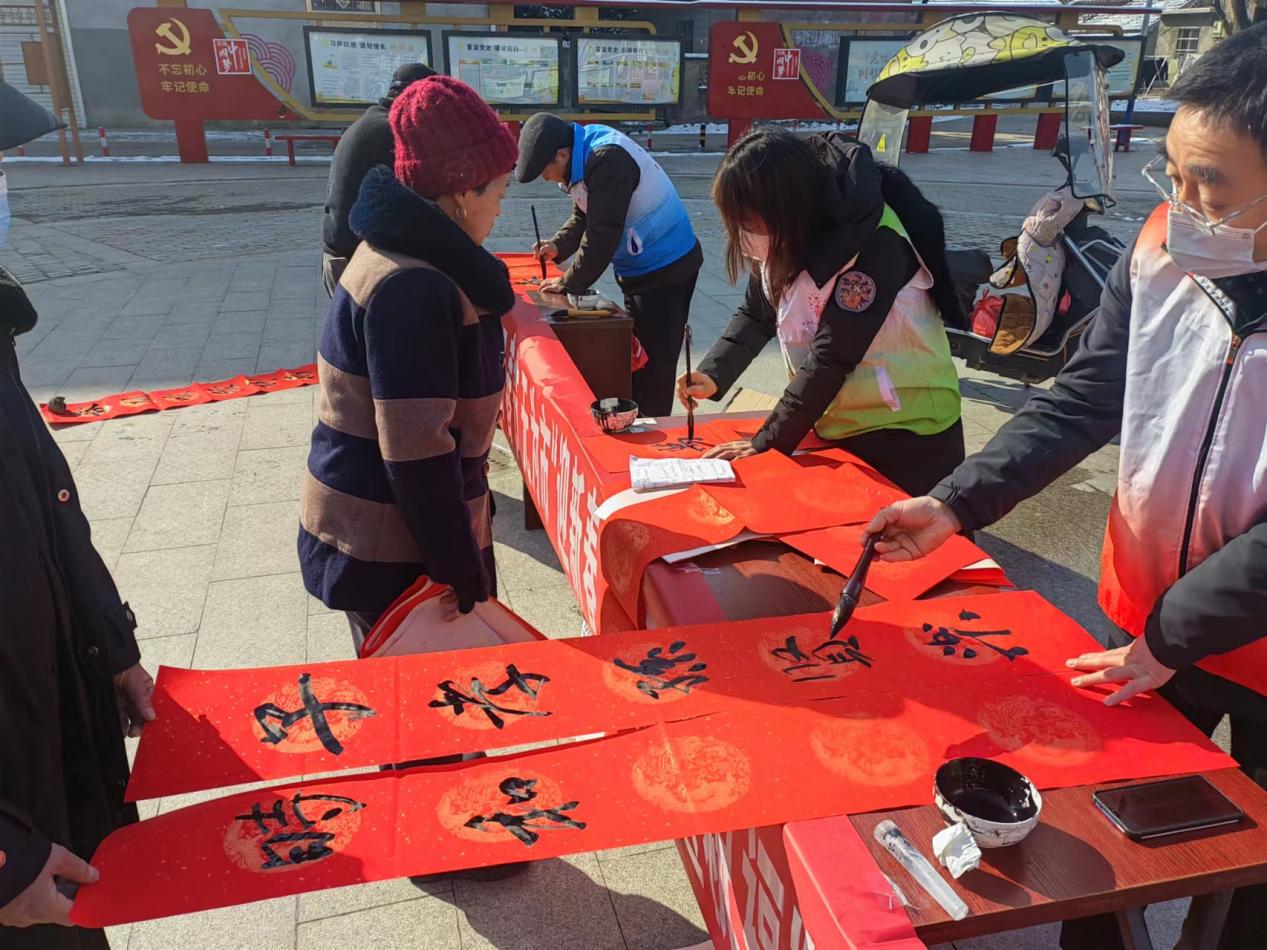 “無聯不成春,有聯春更濃”,活動現場,一張張長桌上擺滿紅紅的對聯紙,多名書法愛好者揮毫潑墨,筆鋒婉轉,以寫“福”、送春聯的形式,為社區居民送上新年的美好祝福。雖然天氣寒冷,但是他們依然熱情高漲,一張張充滿新春祝福的“福”字躍然紙上,一副副寓意吉祥的春聯,帶著黨和政府滿滿的關懷與深深的祝福送到居民手中。