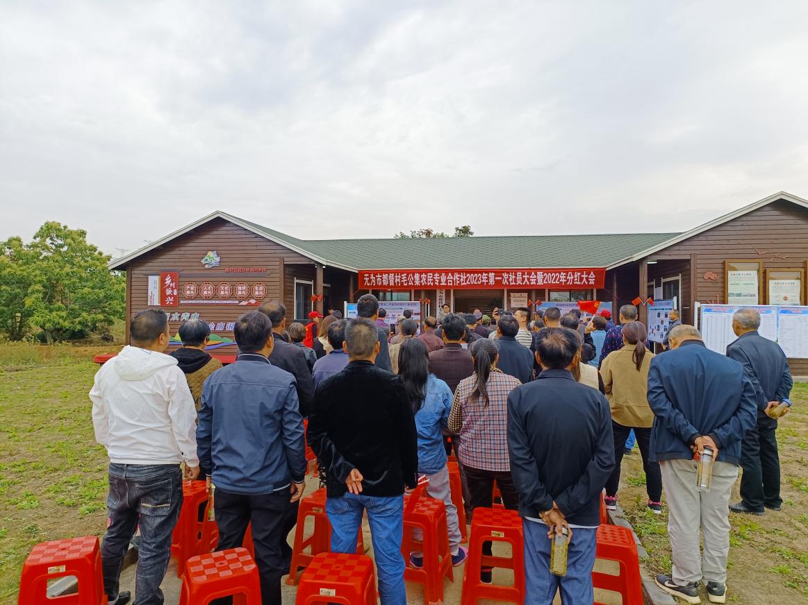 “全體起立,奏國歌”,在莊嚴的歌聲中,都督村黨組織領辦合作社分紅大會正式開始。“都督村毛公集農民專業合作社成立于2022年元月份,是蕪湖市首批‘五星級’合作社”,都督村黨總支書記孫曉山向合作社社員們介紹合作社工作開展情況。“去年合作社剛起步,遇到的困難不少,群眾有質疑的,也有觀望的,但我們秉持著求發展、謀發展的決心都堅持了下來,種山芋、裝粉絲、送粉絲,我們都是村干部自己上,在所有人的努力下,都督村合作社的發展取得了明顯的成效。”2022年,都督村黨組織領辦合作社實現營業收入120萬元,凈利潤26萬元,股東分紅收益18萬元,每股分紅160元,入社回報率達26.7%。