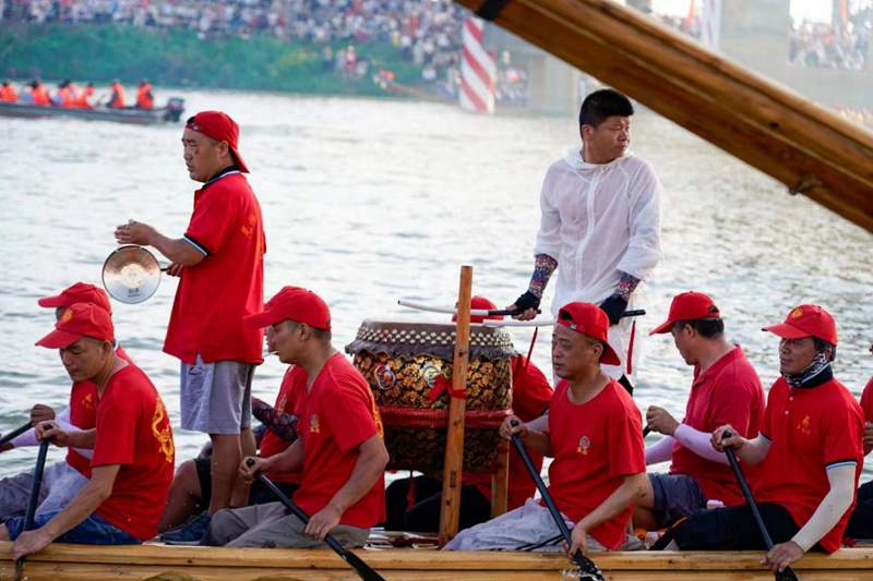 賽龍舟是一項古老的傳統體育活動,也是中國的非物質文化遺產之一。這項活動不僅考驗參與者的體力和團隊合作精神,也具有濃厚的文化內涵。裕溪河水面上,上百條龍舟排列整齊,整裝待發,一人一槳、一張一弛、一心一意,同步劃槳、默契協作,這是智慧與體能的比拼、團隊與團隊的戰斗、堅韌與退縮的角逐。水面上不僅有年壯氣銳的男子漢駕駛龍舟,還有不讓須眉的巾幗英雄比拼鳳船。百舸爭流,奮楫者先;千帆競發,勇進者勝,五公里的水道,隊員們相互支持、相互配合,共同追求最佳表現。