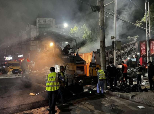 現場的施工人員說道:“要趁著高溫趕緊壓實,現在氣溫低,瀝青溫度低了就會壓實不足,影響路面鋪設的質量。”在人與機械的配合下,瀝青被壓得越發緊實,黝黑而平整的路面逐漸延伸。深夜里,奮戰在項目一線的工人和鎮村干部們,用他們辛勤的汗水,譜寫了新時代高溝建設的優美樂章。