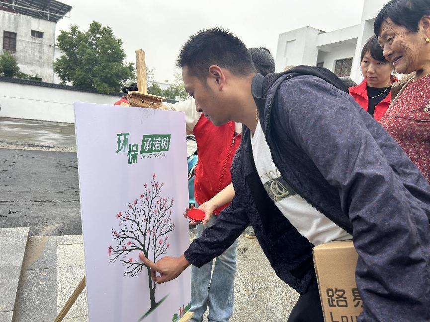 請(qǐng)到場(chǎng)的村民在“環(huán)保承諾樹”上鄭重按上手印,代表著一份份堅(jiān)定的承諾,共同為鄉(xiāng)村的美麗未來貢獻(xiàn)自己的力量。