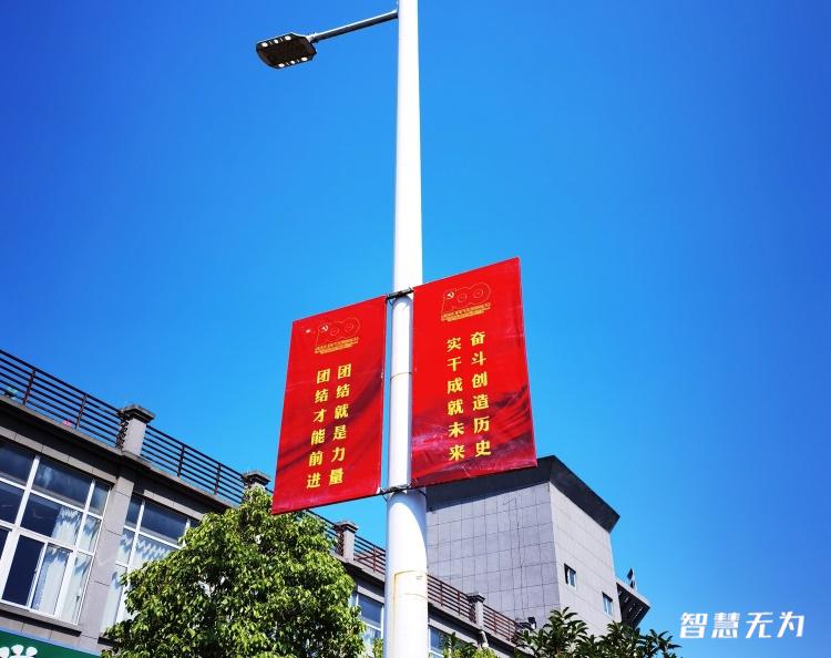 行走在大街上,映入眼簾的是或點綴在綠樹叢中,或迎風傲立在路燈桿上的道旗,每幅道旗底色均為紅旗色,最上面是慶祝中國共產黨成立100周年標志,下面是金色標語,整體莊重大方。這是無為市城管局結合黨史學習教育,創新舉措,扮靚城市,營造歡樂祥和的節日氛圍,喜迎中國共產黨成立100周年。