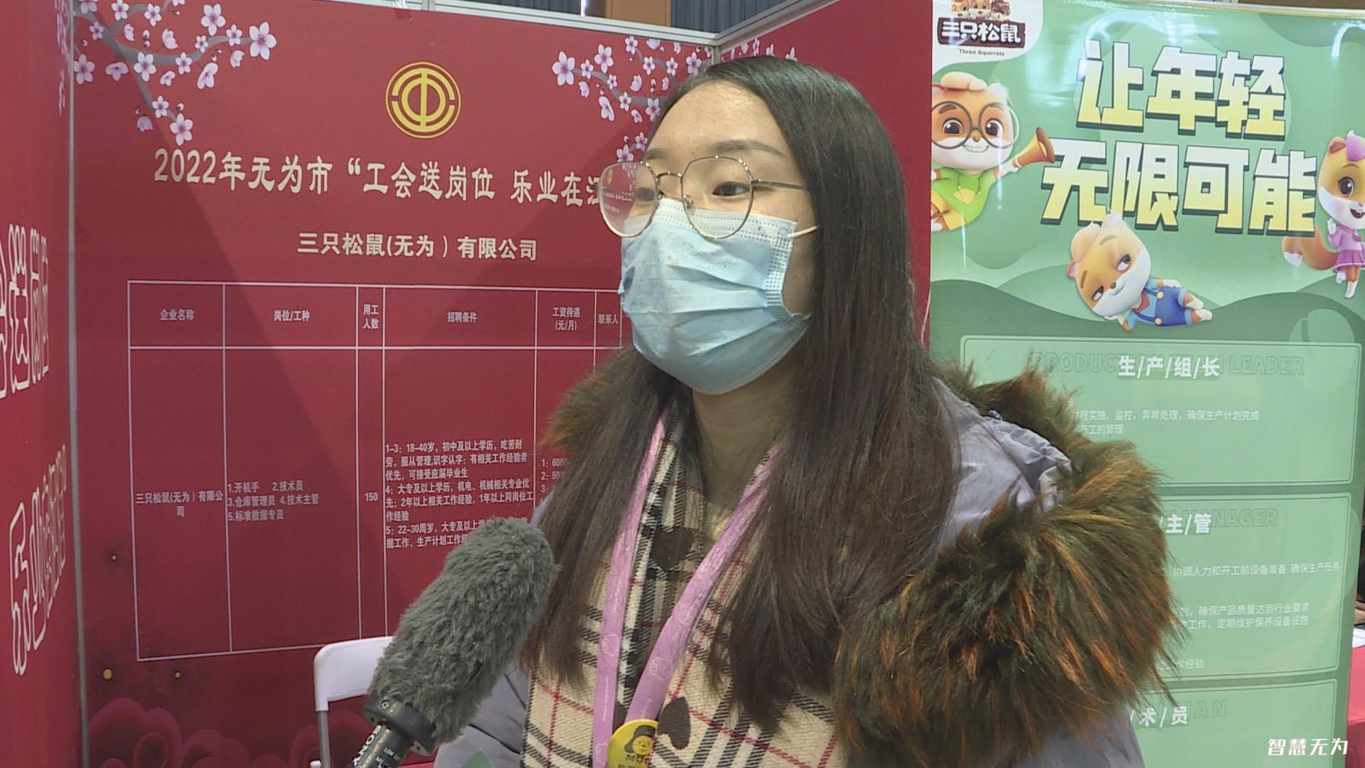 “對于我們?nèi)瞬艁碚f更傾向于一種我們使用機器的人員,另外一個是我們優(yōu)化以及進行維修人員,所以我們今天現(xiàn)場招聘的更多的是生產(chǎn)組長和使用機器的技術員,我們更希望他們能給松鼠企業(yè)去帶來一些優(yōu)化想法。”三只松鼠無為有限公司 人事專員朱麗麗告訴記者。