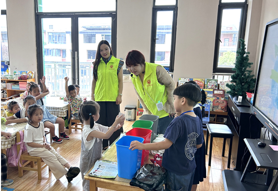 在互動(dòng)環(huán)節(jié),宣傳員和孩子們開展了垃圾分類的趣味搶答游戲,在宣傳員隨機(jī)說出生活垃圾物品名稱后,由小朋友們舉手搶答,答對有獎(jiǎng);在模擬分類投放環(huán)節(jié),宣傳員選出了兩位小朋友作為“小小志愿者”,分別站在模擬投放分類垃圾桶兩側(cè)進(jìn)行監(jiān)督,再邀請舉手的小朋友們上臺,將寫有模擬垃圾物品名稱的卡片放入正確的垃圾桶內(nèi)。當(dāng)小朋友投放不準(zhǔn)確時(shí)則由“小小志愿者”進(jìn)行指導(dǎo)。游戲結(jié)束時(shí),宣傳員向小朋友們一一發(fā)放了禮品,號召小朋友們爭當(dāng)“分類小天使”,在生活中養(yǎng)成垃圾分類的好習(xí)慣,帶動(dòng)自己的家人“分類齊步走 時(shí)尚我先行”,共同做好垃圾分類工作,得到全體小朋友們的積極響應(yīng)。
