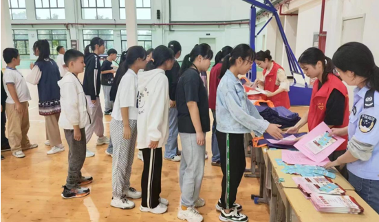 圖為志愿者為學生發放宣傳手冊、倡議書及書簽
