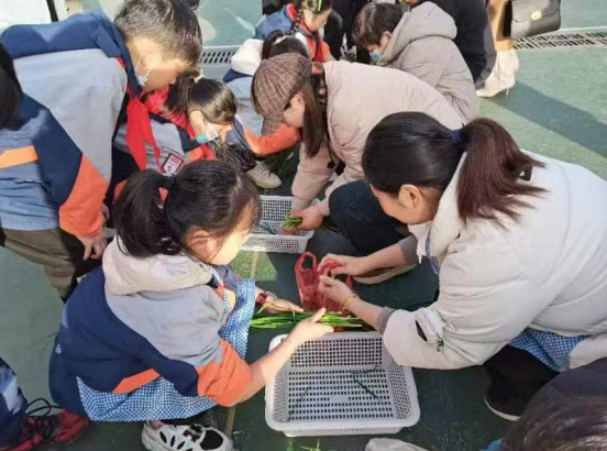 四年級開展的是”擇菜、洗菜“比賽。小朋友們和家長一起認真地清理韭菜上的枯葉、污泥等雜物。家長們邊勞動,邊傳授孩子勞動技巧,孩子們不僅收獲了勞動知識,還收獲了快樂,一個個喜笑顏開。