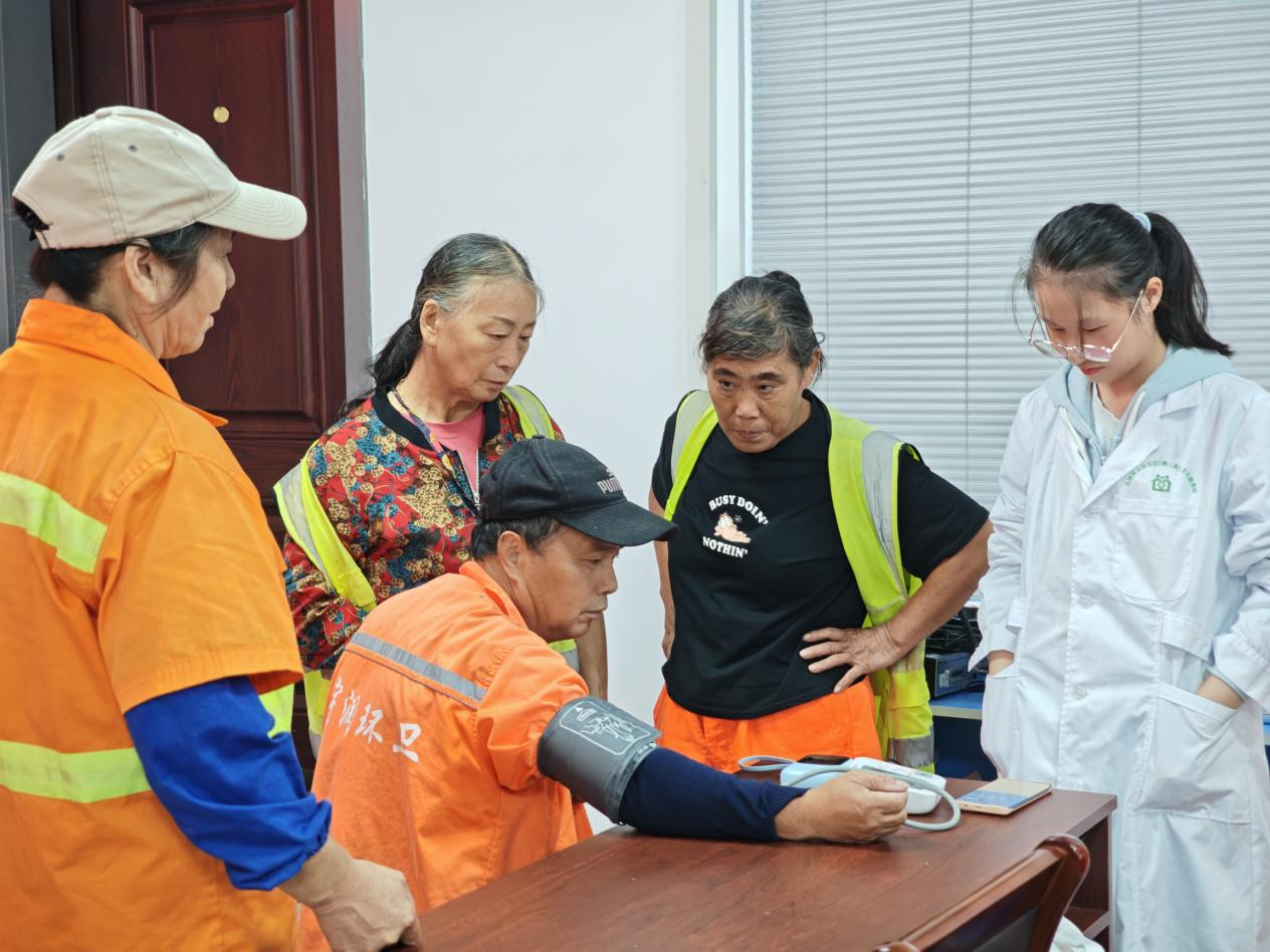 健康講座結束后,義診環節隨即拉開帷幕。社區衛生服務站的醫生為環衛工人提供了免費的血壓測量、血糖檢測,以及內外科咨詢等服務。醫護人員耐心細致地為環衛工人進行檢查,詳細詢問他們的身體狀況和用藥情況,并根據檢查結果給出個性化的健康建議。